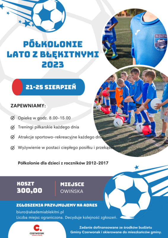 Akademia Piłkarska Błękitni Owińska organizuje letnie półkolonie LATO Z BŁĘKITNYMI 2023 dofinansowane ze środków budżetu Gminy Czerwonak!