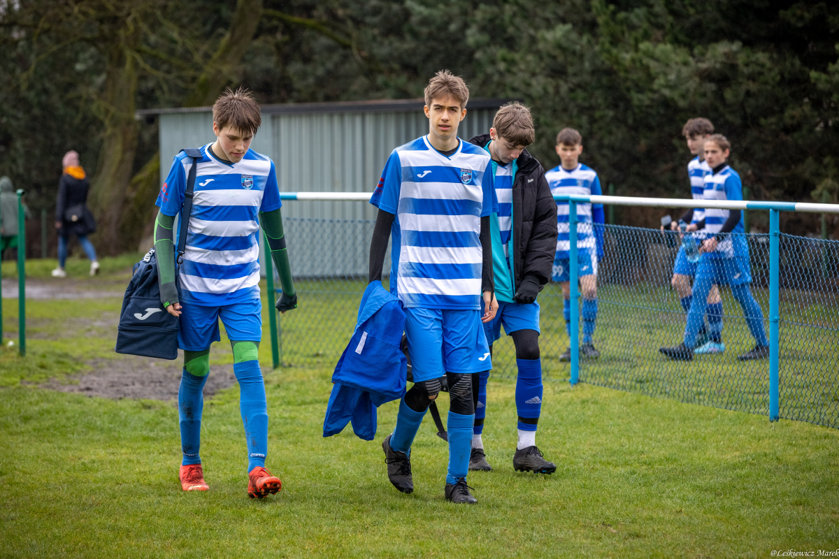 boisko było bardzo śliskie, zawodnicy często tracili przyczepność i przewracali się. Gra naszego zespołu była bardzo chaotyczna i pozbawiona dokładności, choć o braku zaangażowania nie można było mówić. W 23 minucie strzelamy bramkę na 1:0